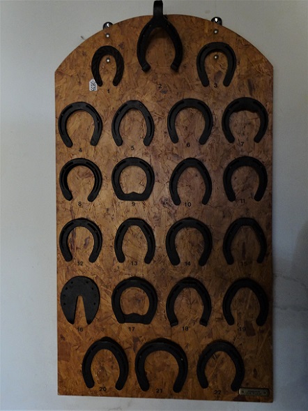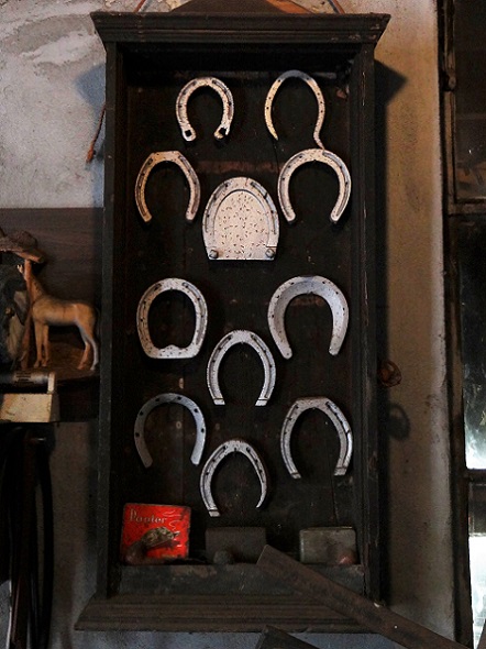 Sinds die opmerking van Harmien let ik wat scherper op opgehangen hoefijzers en dan kom he ze inderdaad ook meer tegen. De praktijk van het hoefijzers ophangen blijkt dan weerbarstiger dan het voorschrift. Zo zag ik in de het rijtuigdeel van Museum Nienoord, met name de stal, onlangs deze plank met verschillende soorten hoefijzers: