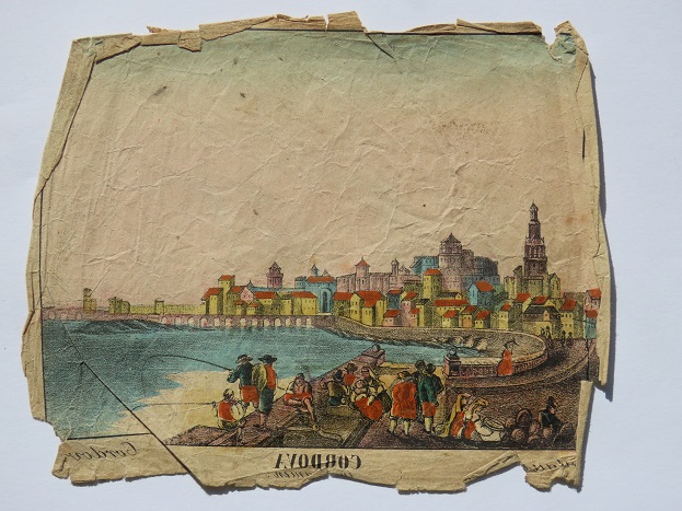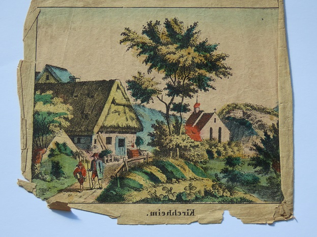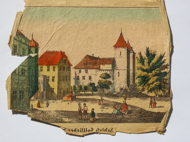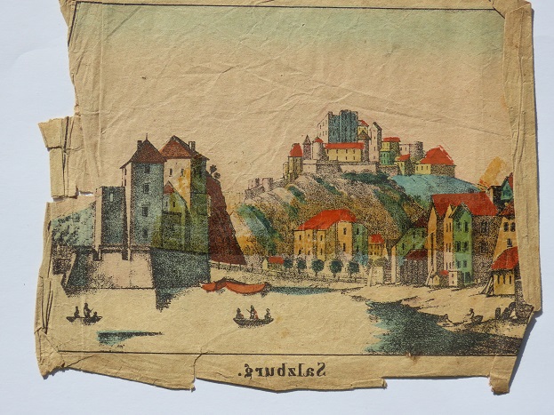 Wat me meer dan de gedichten aansprak, was een bij het katern inliggend mapje met gravures van stadsgezichten en bezienswaardigheden uit Duitsland, Zwitserland, Oostenrijk, Frankrijk, Italië en Spanje. Gezien de voertaal betreft het een Duitse serie, maar onder de om onbekende reden spiegelbeeldig gezette Duitse titels staan kleiner gezette Franse vertalingen, zodat je een en ander wellicht zou kunnen dateren op ca. 1810. Oorspronkelijk waren ze zwartwit , naar ze zijn in volgende drukgangen voorzien van kleuren.