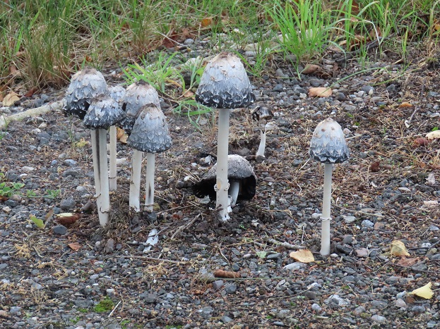 Geschubde inktzwammen, net niet meer eetbaar, op een dam met steenslag van de Wobbesheerd tussen Engelbert en Oostwold: