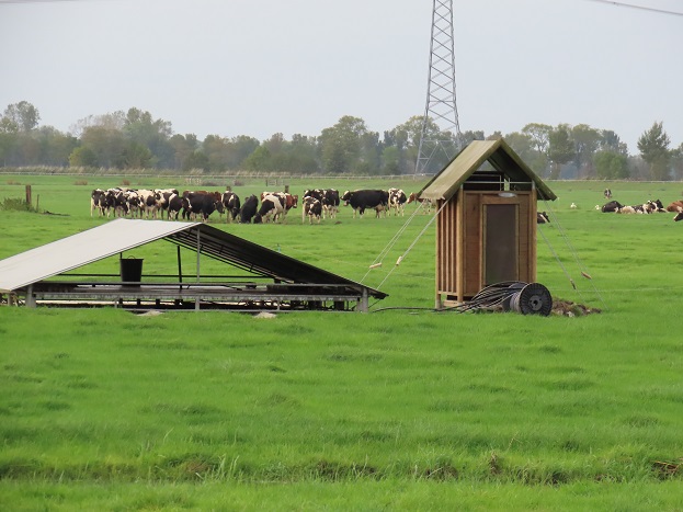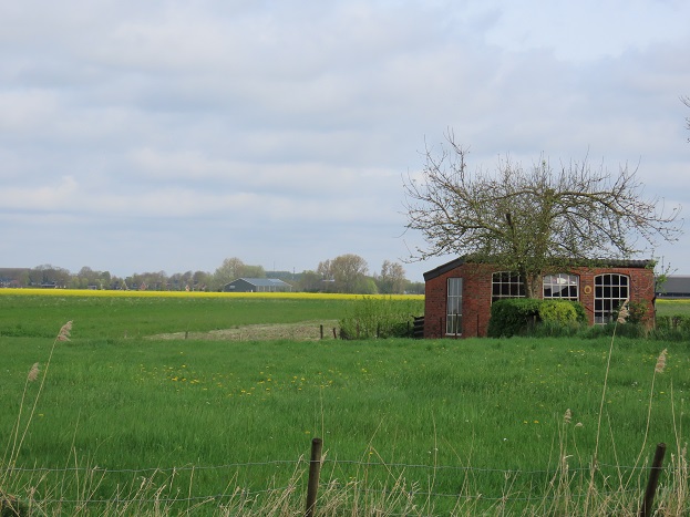 Een paarminuten verder fietsen naar Oostwold lagen in het land enkele daken als op de foto, en er stond een soort van pleehokje naast. Gezien de stroomkabels had een en ander wellicht te maken met zonnepanelen. Wie het weet, mag het zeggen.