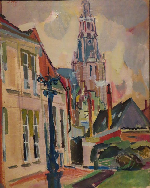 Jan Jordens, de A-toren in de stad Groningen vanuit de Akerkstraat nabij de Grunneger Sproak, 1939. De kleuren van de toren zijn nog die van voor de grote schilderbeurt begin jaren 80, blauw en grijs (nu deels oker):