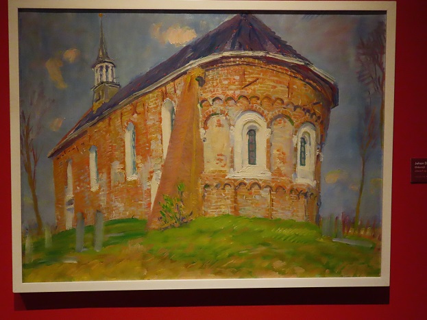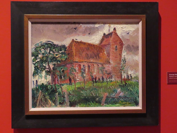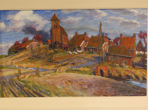 Jannes de Vries, de kerk van Oostum, die het meest te zien was en waarschijnlijk ook het meest geschilderd is door leden van De Ploeg. (Op dit punt begint het fietspad dwars door weilanden naar Wierumerschouw:)