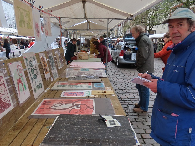 Geplaatst op: 2 april 2024 Hoort bij: Kunsten, Oosterpoort, Stad nu 2 reactiesDacht dat er gistermiddag een festivalletje op het suikerfabrieksterrein zou zijn, maar daar bleek helemaal niets te doen, zodat ik maar ben doorgefietst naar de Vismarkt waar een Zeldzaam Mooi Markt plaatsvond. Wie je op dat soort markten altijd vinden kunt, is oud-buurtgenoot Frits Casparie met zijn hout- en linoleumsnedes: