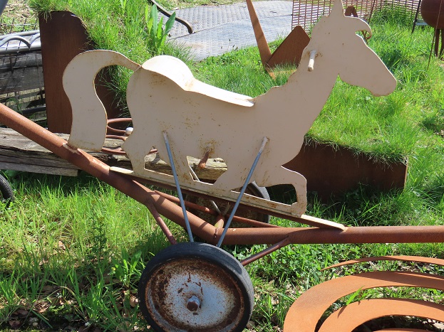 Geert Pruiksma directeur van Museum Nienoord en samensteller van deze expositie vond het blijkbaar wel een aardig idee een echte, maar aan het ene rad te zien nogal gemankeerde ploeg bij de schilderijen neer te zetten.