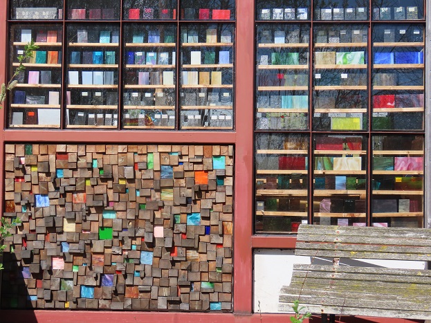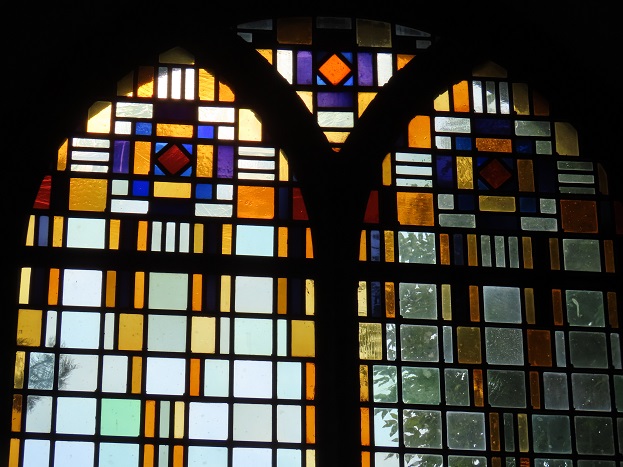 Glas-in-lood naar de geometrische Stijl. Het lijkt me dat de kruisiging kubistisch of zo is uitgebeeld. Het rode ruitje staat voor de neus vana Christus miden op zijn gezicht: