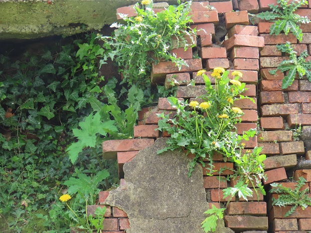 DE muren van de ringover raken weer aardig overwoekerd door berenklauwen en paardenbloemen, wortelend in de uitgespoelde voegen: