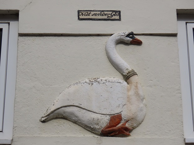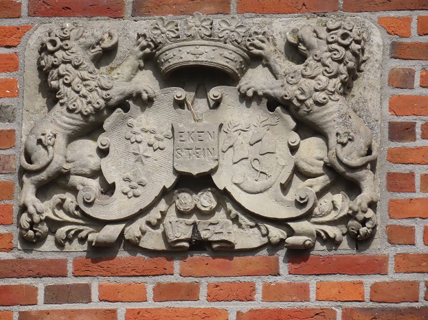 Een eindje verder aan het Damsterdiep ligt de buitenplaats Ekenstein, met op de bijbehorende schuur deze rijk bewerkte gevelsteen: