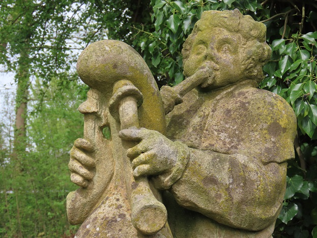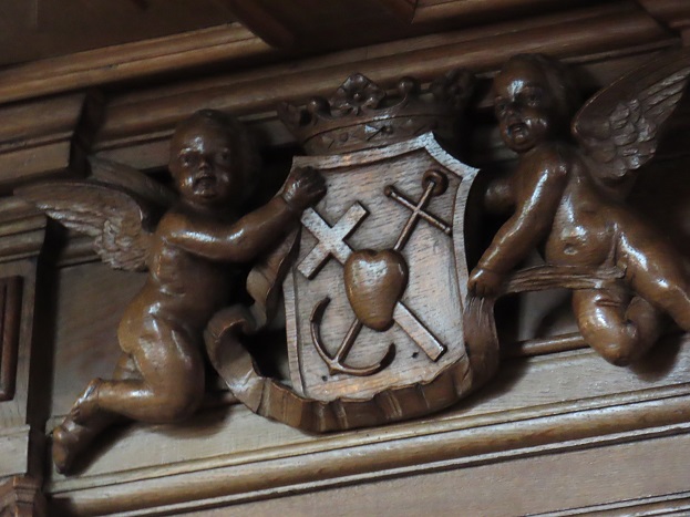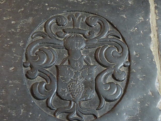 Terug naar de 17e eeeuw met de figuren van haar tijd. In de ovaal staat een wapenschild met hangende druiventros met naar boven gerichte bladeren. Soortgelijke druiventrossen willen ook nog wel eens het Land van Belofte (Kanaän) symboliseren.