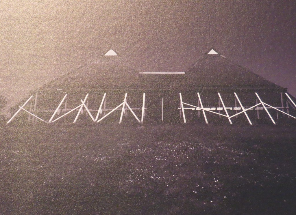 Erg fraai vond ik deze weergave van de enorme boerderij Feldwerdervoorwerk nabij Kolhol (onder Spijk) met oplichtende stutten bij donkere avond: