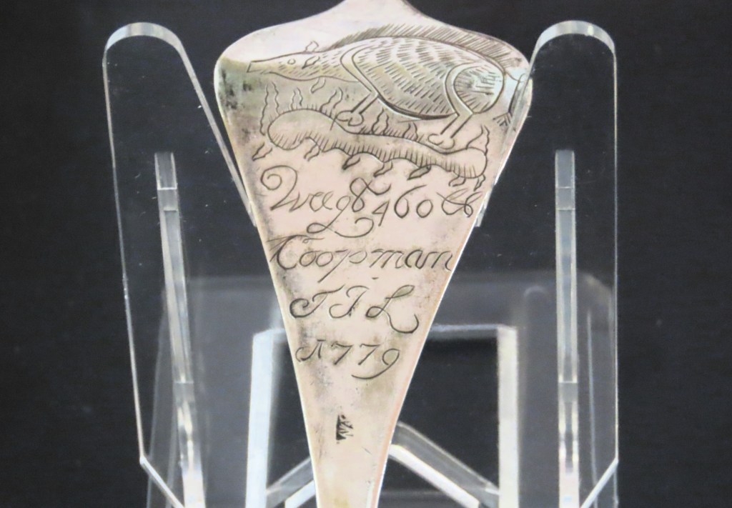 Tot slot het boveneind van een recent door de Zilverkamer verworven ”zwijnslepel’ met ingegraveerde afbeelding van prijsvarken wegende maar liefst 460 pond, welke lepel in 1779 aan zijn klandizie werd uitgeloofd door de varkenskoper Tjeerd Jans Lantinga uit Onderdendam (Menkeweer):
