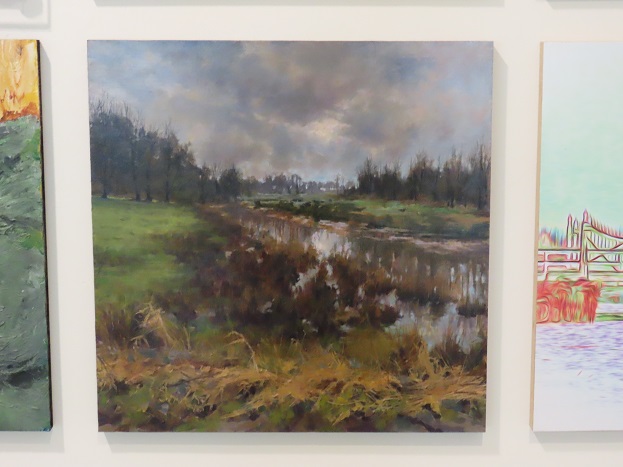 De wat meer bekende, professionele schilders kregen gelukkig meer de ruimte. Zoals Geert Schreuders, mij vooral bekend van historische voorstellingen, met dit rationele agrarische landschap en diens genuanceerde tinten van bluiend eerappellaand: