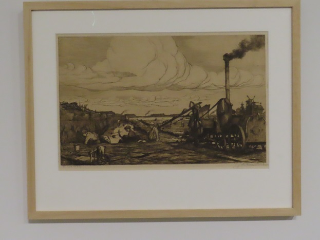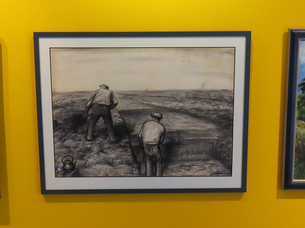 In een afzonderlijk kabinet hangt het werk van Ploeg-kunstenaars, zoals deze veenarbeiders van Johan Dijkstra. Uit hun put met hoogveen is de bovenste laag (bonkveen) al verwijderd – die gaat straks weer door het onderliggende zand dat ermee tot dalgrond verwerkt word. Naar onderen toe wordt de turf steeds donkerder en beter voor huisbrand: