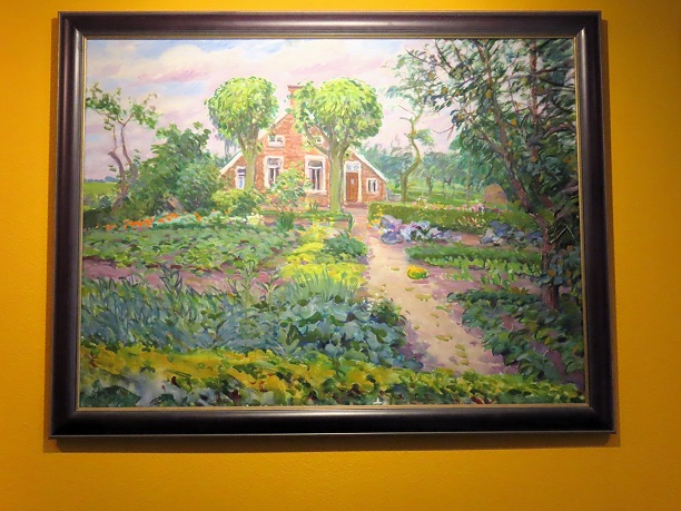 Of die veenarbeiders net als hun collega’s op de klei, ook aan éénschaftsarbeid deden, weet ik niet, maar misschien hadden ze bij hun woning ook wel zo’n grote moestuin, waarop ze dan vooral ’s middags werkten. Van Johan Dijkstra is dit kleurige doek van het huis bij de Rhederbrug (oostkant Bellingwolde), bewoond door de landarbeider of dagloner Geert Sandjer: