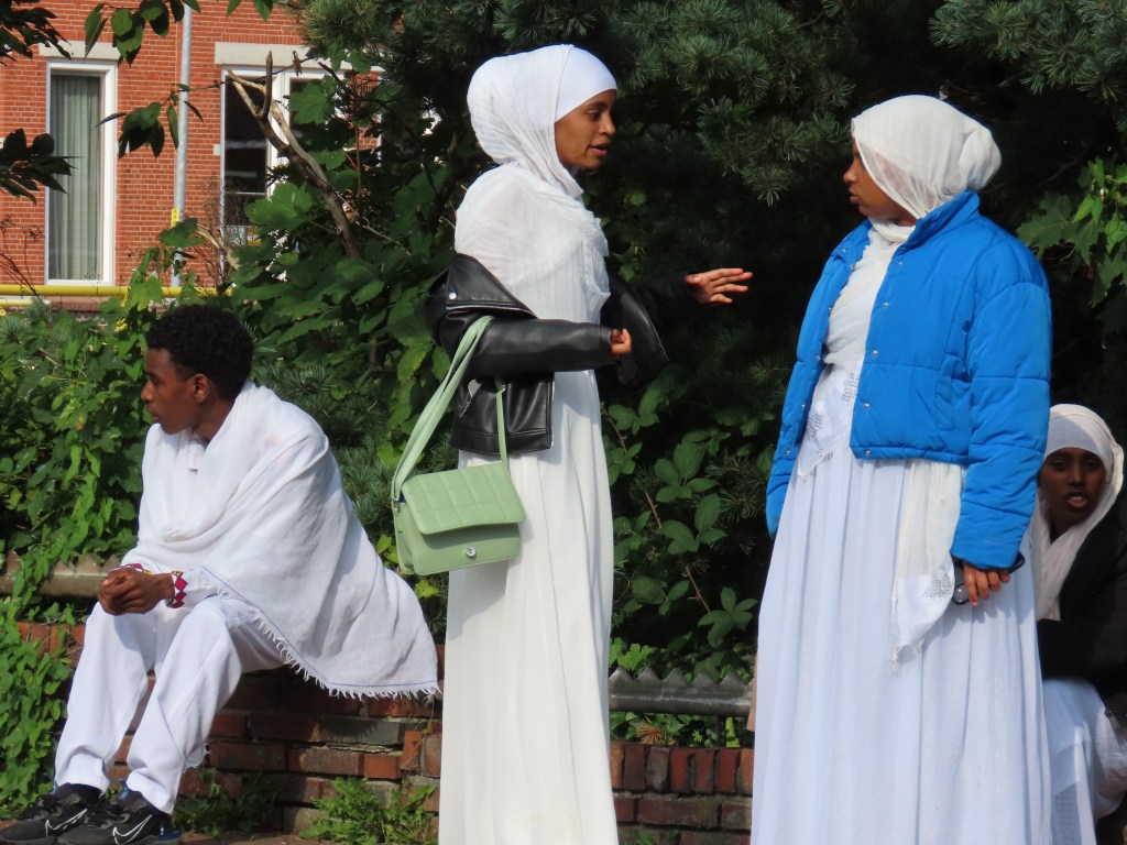 Bij terugkeer in Hoogkerk was net de Eritreesche kerk uitgegaan en wahtten hun kerkgangers bij alle bushaltes: