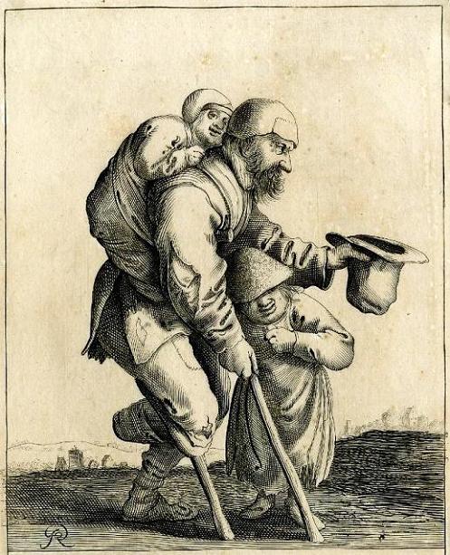 Het stel oorlogsgewonden wordt als volslagen debiel voorgesteld. Nog een graadje erger is de prent die Adriaen Matham omstreeks 1640 maakte naar een verloren gegaan schilderij van de genreschilder Adriaen van de Venne: