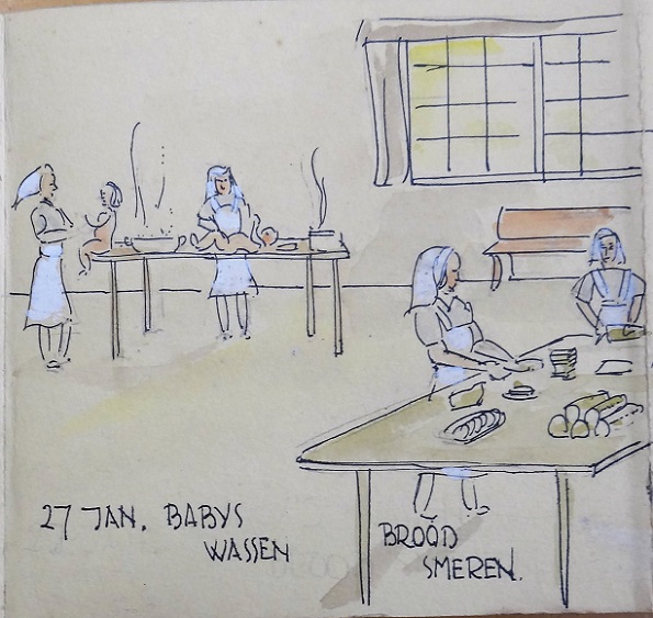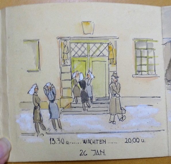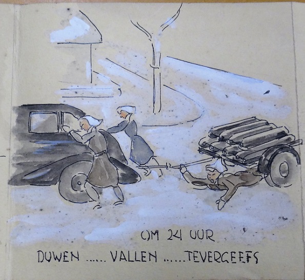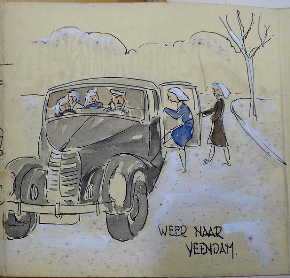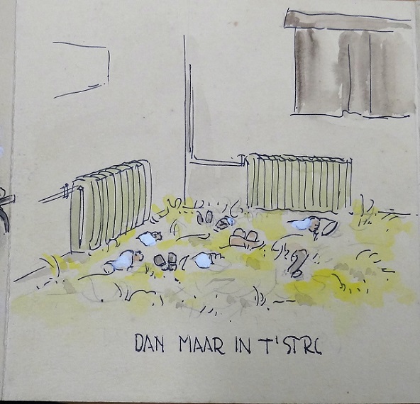 Geplaatst op: 18 februari 2020 Hoort bij: Geschiedenis, Kunsten 5 reactiesIn een cahier met de getekende oorlogsdagboeken van landschapsarchitect Geke Hollema (1919-1991) zit een soort strip opgevouwen, over de opvang van Roermondse evacué’s in Stadskanaal, op 26 en 27 januari 1945. Hollema was daarbij, waarschijnlijk als chauffeur van een ploeg verpleegsters uit Veendam. Hier volgt zijn strip: