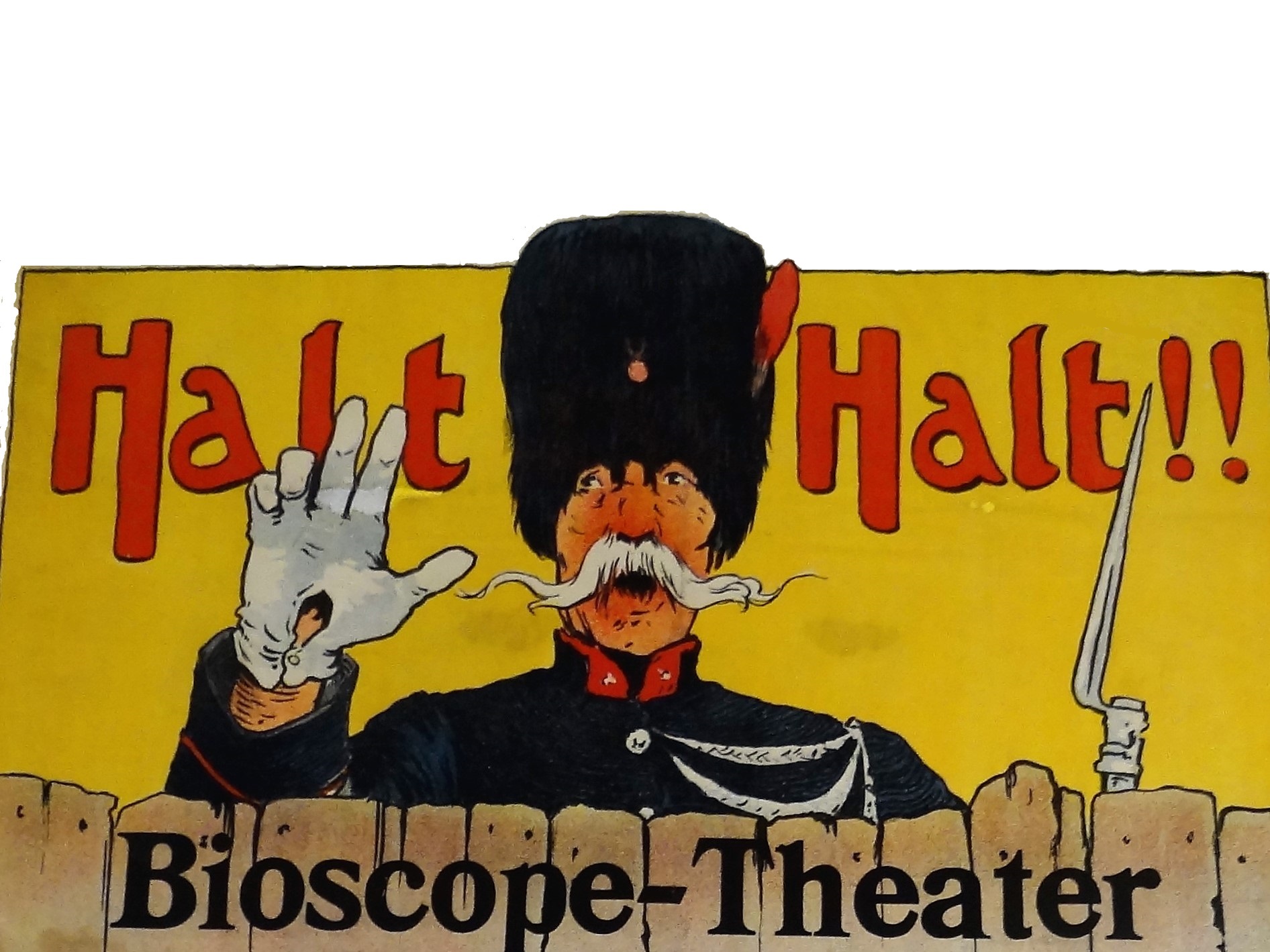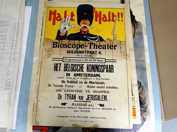 Aansprekend aan het bioscoopaffiche is vooral de figuur van de soldaat achter de schutting. Die staat wel heel ver weg van Werkmans latere beeldtaal. Maar waarschijnlijk heeft Werkman juist dit kleurige deel van het affiche niet gedrukt, en betreft het een passepartout, waarvan de bioscoop afgepaste stapels aanleverde, en waaraan Werkman slechts het actuele programma hoefde toe te voegen: