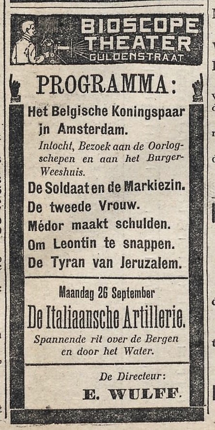 Het bleek 1910. Het Bioscope Theater aan de Guldenstraat bestond van 1908 tot 1912. E. Wulff was er tussen september 1910 en mei 1911 de directeur van. en exact hetzelfde programma stond op 24 september 1910 als advertentie in het Nieuwsblad van het Noorden: