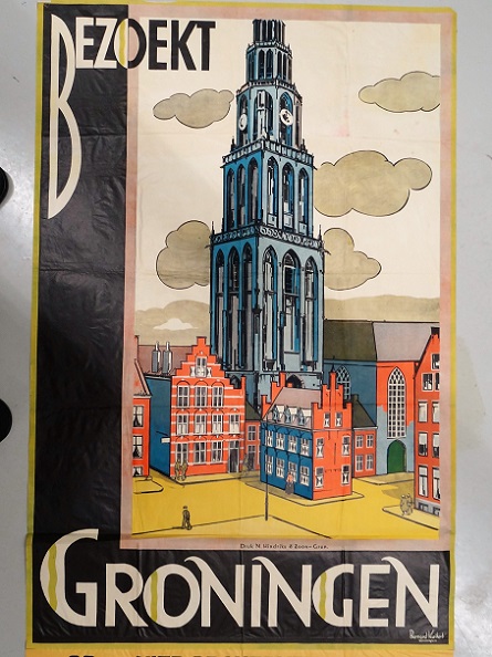 ‘Wie Groningen niet kent, kent Nederland niet‘ was een VVV-campagne die maar liefst twintig jaar heeft gelopen, vanaf 1931. Veel geholpen heeft het niet, maar dit experimentele, scheve affiche zal vast wel spraakmakend geweest zijn: