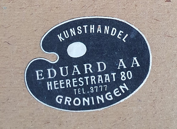 Kunsthandel Eduard AA bevond zich volgens het plakkertje op de hoek van de Herestraat en het Zuiderdiep, de meeste Groningers nu nog wel bekend van sigarenzaak Homan. Dit was een A-locatie in de Stad – alle treinreizigers kwamen er nog langs op weg naar de winkelstraten en café’s in de binnenstad of de bushaltes even verderop aan Zuiderdiep en Damsterdiep. Op zo’n plek moest je flink omzet draaien om de huur op te kunnen brengen, ook vroeger al.