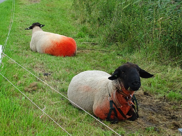 Via de nieuwe brug van Aduard, het pad langs Fransum en de Ezinger Zuiderweg binnendoor naar Ezinge gefietst. Achter het transportbedrijf bij de Medenerweg (daar waar het pad naar Fransum afsplitst), lagen deze schapen in een afgeperkt stukje berm. Na gedane arbeid is het goed rusten: