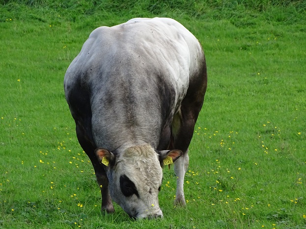 De vlakbij grazende stier:
