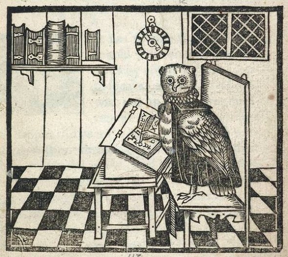 Een wat fijnere prent van bijna een halve eeuw later toont nog steeds die uil, bij nacht en ontij bezig met het vergaren van wijsheid en kennis: