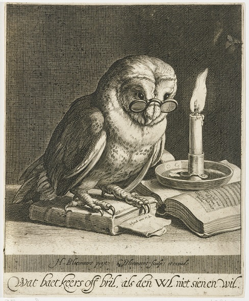 Cornelis Bloemaert (II) naar Hendrick Bloemaert, Uil met bril en boeken, ca. 1625. Collectie Rijksmuseum.