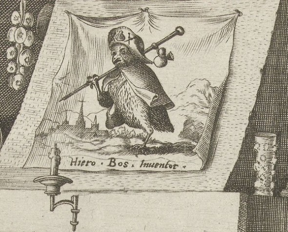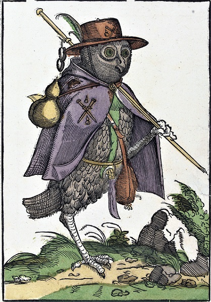 Hierboven zien we een dergelijke uil als beeldcitaat op een Vastenavondprent uit 1567. De inventor van de geciteerde houtsnede was Jeroen Bosch. Diens uil stapt, beladen met zonde en onreinheid, van het duister in het klare daglicht en gaat met bedelstaf en schelpenhoed op naar Santiago de Compostella om penitentie voor zijn zonden te doen. Het is dus eigenlijk een deugmens, of althans: dat wil hij worden. En om te laten zien dat het hem menens is doet hij de lange wandeling op slechts één been, zodat hij dubbel zo lang onderweg is.