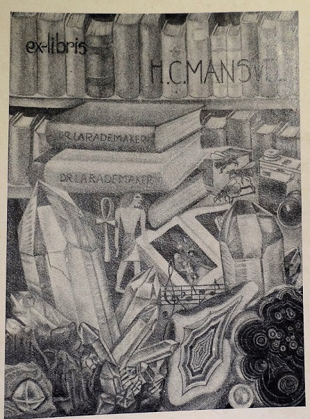 De oudere tijdschriften, deels van ver voor de oorlog, zijn ingebonden en voorzien van een ex libris van ene H.C Mansveld. Erg mooi kan ik het stukje grafiek niet vinden, mij teveel vage floep, maar ik vond het wel enigszins intrigerend. Er staat een boekenkast op waar een paar kloeke delen voor liggen met op de rug de naam van de spirituele veelschrijver dr. L.A. Rademaker, kennelijk het geestelijk kompas waarop Mansveld voer. Verder toont het ex libris een paar bijen, veel kristallen, een notenbalk met de eerste tonen van een mij onbekend muziekstuk, naast enkele hippie-achtige motieven die je ongetwijfeld in kleur had moeten zien.