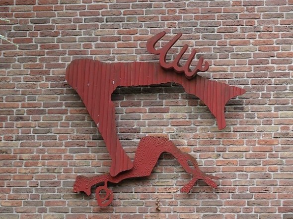 Aan de rijk belommerde huizen uit de wederopbouwperiode hingen soms aardige ornamenten. Zoals dit trio nobele wilden (Cobra of cliché?):