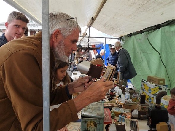 Weer buiten. Had onderweg gezien dat er een antiek- en rommelmarkt was op de Vismarkt en moest daar natuurlijk wel even kijken. Man bestudeert oude foto: