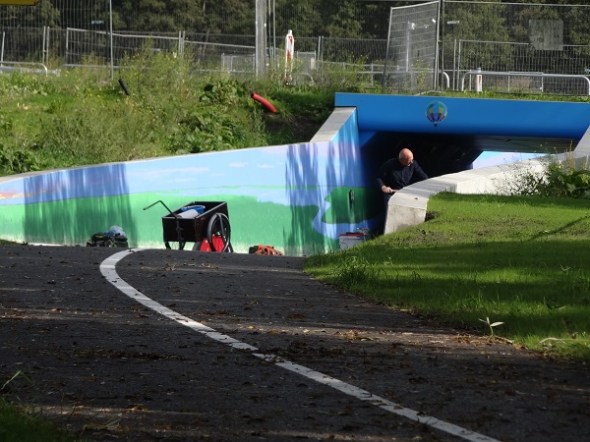 De kunstenaar bleek druk aan het werk in het westelijke deel, dat naast het tolhuis uitkomt: