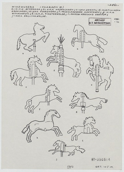 Trof deze aan in de beeldbank van de RCE. Het betreft een vrij recente calque van een Monumentenzorgtekenaar. Te zien zijn op de bovenste rij de windvanen van de hervormde kerken in Scheemda en Noordhorn, op de tweede rij die van de toren in Beerta en de Martinitoren in Stad, op de derde rij die van de Fraeylemaborg en de Winschoter kerktoren, op de vierde rij die van de toren in Finsterwolde en Openluchtmuseum ’t Hoogeland in Warffum en helemaal onderaan die van de Bellingwolder toren.