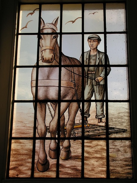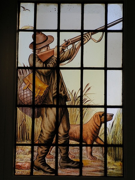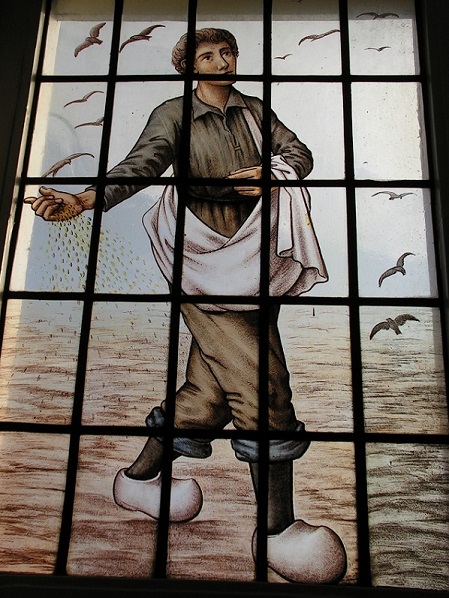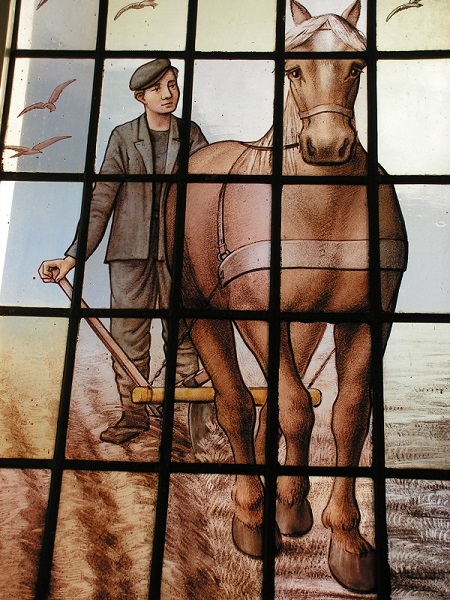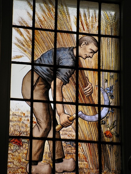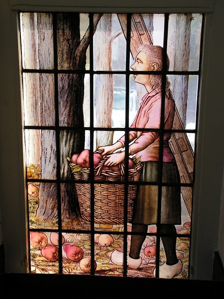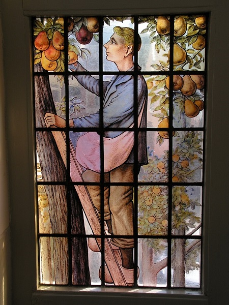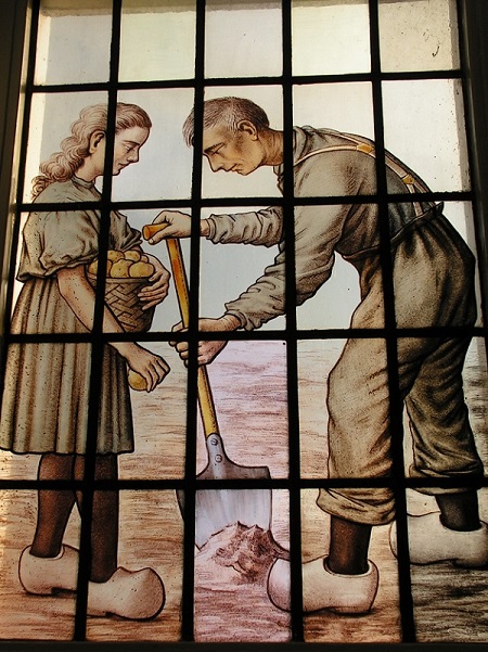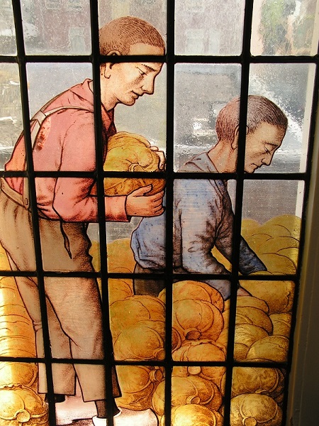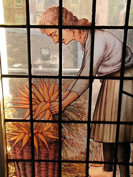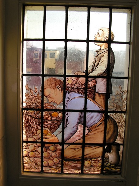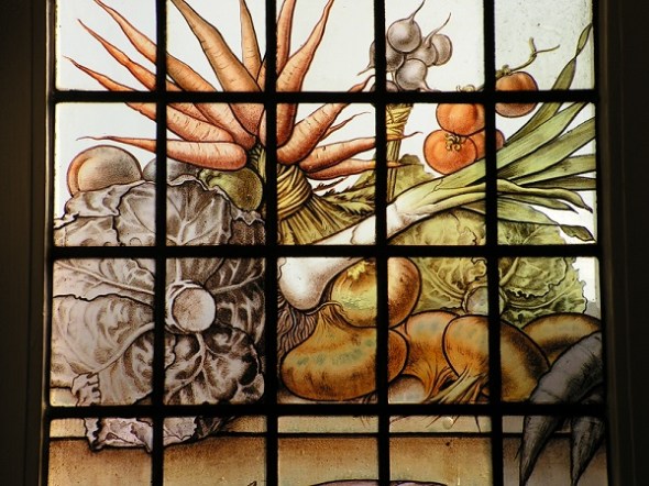 Oorspronkelijk stond op deze lokatie aan het Groninger Zuiderdiep de Volksgaarkeuken, een laag gebouw uit 1871. In 1930 werd dit gemoderniseerd en hernoemd tot het Woon- en Eethuis voor Allen, onder Groningers beter bekend onder zijn afkorting WEEVA. Volgens een van de ruiten werden de ramen geplaatst bij het 70-jarige bestaan van deze “inrichting”. Dat jubileum zal slaan op de Volksgaarkeuken – de ramen dateren derhalve uit 1941. Verder is er heel weinig documentatie over te vinden, zelfs de maker is onbekend, iets wat mogelijk samenhangt met de tijd dat ze vervaardigd werden. Ze hebben als onderwerp de manier waarop voedsel tot stand komt en met een portie onwelwillendheid zou je kunnen zeggen dat er een bloed- en bodemgeest uit spreekt. Aan bod komen fruitteelt, akkerbouw, jacht en visserij – merkwaardigerwijze ontbreekt echter de veehouderij. Of zouden die ramen verdwenen zijn?