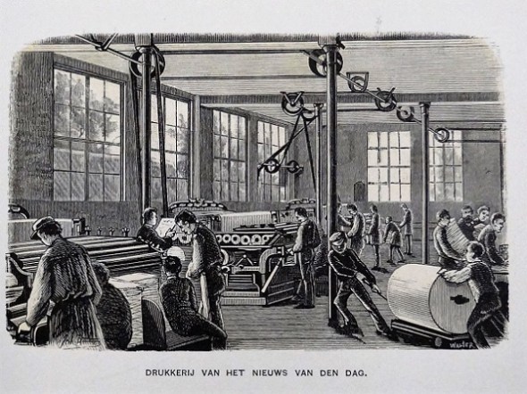 Uit een advertentie van de courant Het Nieuws van den Dag – impressie van de krantendrukkerij: