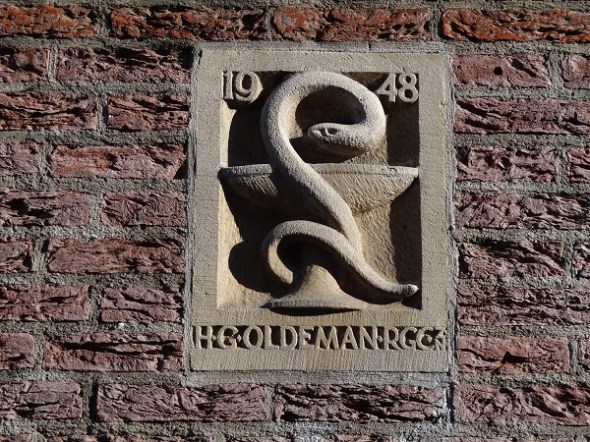 De steen zal een soort eerste steen zijn geweest. Apotheek Oldeman heropende namelijk niet in 1948, maar op maandag 31 januari 1949 haar deuren op deze plek. Sinds 1932 was ze hier gevestigd geweest, maar bij de Bevrijding was het oude pand in vlammen opgegaan, zodat het bedrijf een paar jaar bij een andere apotheek in moest wonen. Daar kwam een eind aan met de oplevering van het wederopbouwpand dat er nu nog staat, een ontwerp van het architectenbureau Nijhuis & Reker. Destijds werd vooral de verkoopruimte in het pand fraai gevonden – dankzij een groot oppervlak aan glas ving die veel licht.
