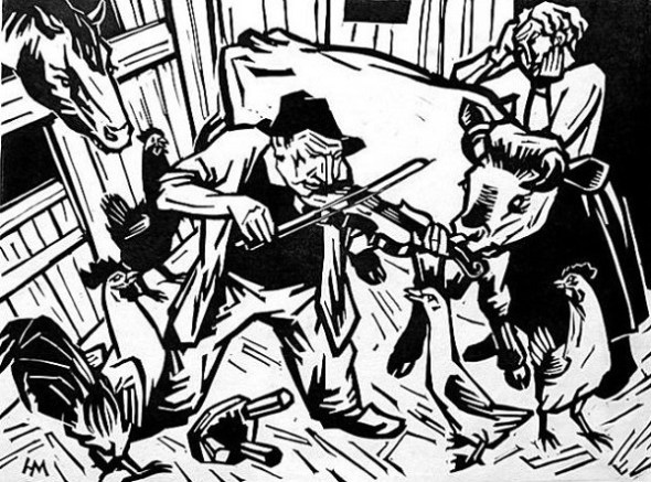 Centraal in beeld van de bewuste lino staat een geconcentreerde vioolspeler. Onder de man ligt een melkkrukje, wat de suggestie wekt dat hij net is opgestaan. Hij gaat dan op in zijn muziek, die schwung krijgt.