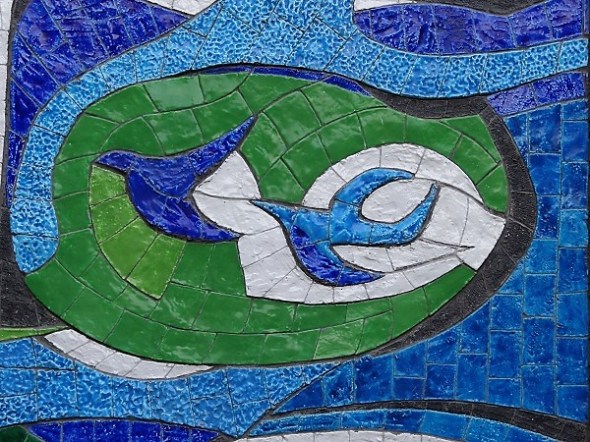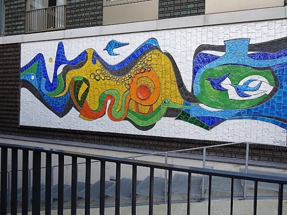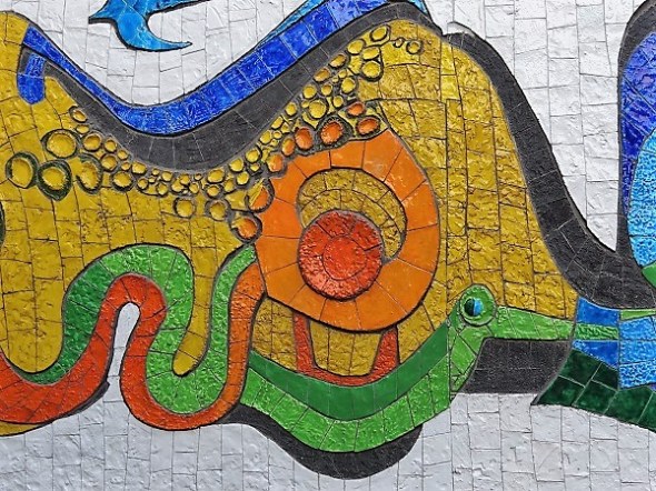 Als je nu zegt: “Het heeft iets Cobra-achtigs”, dan kan dat kloppen, want Giles werkte samen met Karel Appel, van wie ze ook een monumentaal ontwerp voor het Congresgebouw in Den Haag uitvoerde. Ze werkte toen nog voor aardewerkfabriek ‘Porceleyne Fles’ in Delft, die eveneens de tegels voor dit mozaïek van haarzelf produceerde: