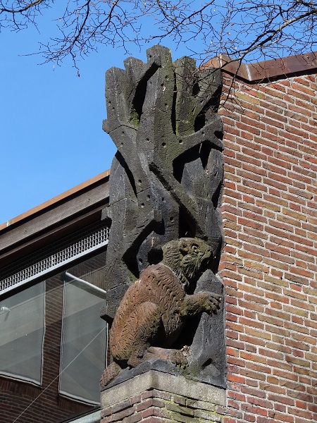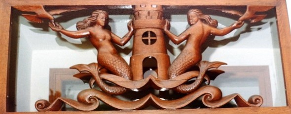 De twee zeemeerminnen houden het wapen van de stad, zeg maar een steenhuis, overeind. Meestal gebeurt dat door een eenkoppige arend. De vormgeving is overigens niet oud, gezien de zeemeerminnenlijven. Ik vermoed dat het een remake is van een veel ouder, ontoonbaar geworden snijraam.