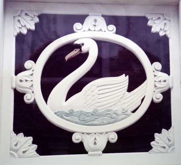 Er stond geen notitie achterop deze foto, maar volgens de website over bovenlichten- en snijramen van Ben Veldstra, bevindt de uitgebeelde zwaan zich nog steeds in Vianen. (doorscrollen naar onderaan de pagina).