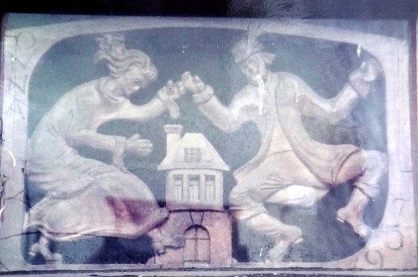 Ook niet oud, want uit 1957, was het volgende snijraam, helaas achter glas toen het gefotografeerd werd. Hoewel het lijkt te reageren op de vorige, markeerde het een adres in een heel andere stad, namelijk Waldeck Pyrmontkade 34 in Den Haag. Op dat adres zit nu een APK-keuringsstation. Het komische snijwerk met het dansende paar rond de toren blijkt daar verdwenen, het ontbreekt ook in de verzameling van Veldstra: