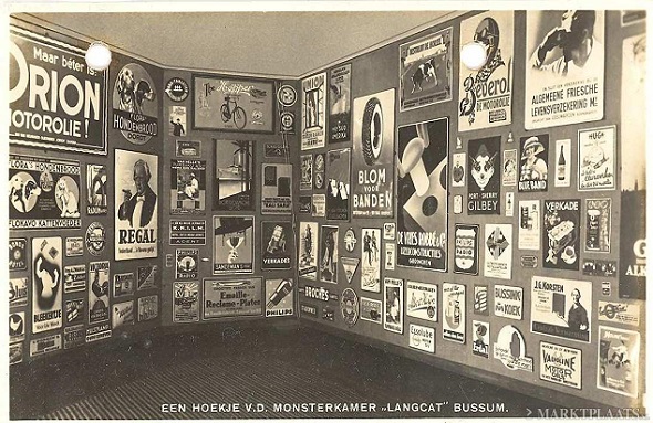 Het is een soort Mauritshuis van de emaille reclameborden. Dat van mijn opa zie ik er ook tussen hangen (rechts). Stel je voor dat je zo’n toonkamer kunt reproduceren op een tentoonstelling. Daar trek je horden mensen mee.