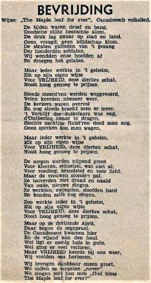 Misschien wel wat te optimistisch over de mate van ons verzet, dit poeem in de Groninger Oranjebode van 21 april 1945, maar het eerbetoon aan de Canadezen was er niet minder welgemeend om. Hier de wijs volgens de Highlanders.