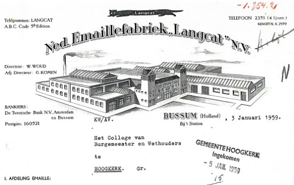 Bij het doornemen van een serie reclamevergunningen van de voormalige gemeente Hoogkerk kwam dit briefhoofd voorbij. De vormgeving doet voor 1959 wat gedateerd aan, maar het betreft toch echt de fabriek van Langcat in Bussum. Dat bedrijf is bekend als producent van emaille reclameborden, maar ze maken ook straatnaamborden, monumentenschildjes, peilschalen, uithangborden en gevelplaten, zo leert hun website, want ze bestaan nog steeds.