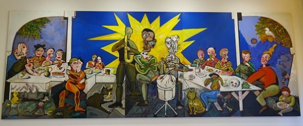 Eigenlijk is het een drieluik. Op het middendeel staat een orkestje te spelen. De sax heeft uitstraling, de gitarist swingt alle kanten op en de drummer is zeer dynamisch: