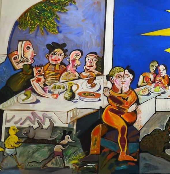Geplaatst op: 9 juli 2017 Hoort bij: Kunsten Een reactie plaatsenWas van de week even op bezoek in het H.N. Werkman Stadslyceum aan de Nieuwe Sint-Jansstraat. Grote verrassing: hier hangt in een soort van studielokaal/kantine het werk ‘Vrede is eten met muziek’ van Lucebert. Eerder hing dit schilderij (uit 1985, acryl op multiplex panelen) in de kantine van een schoolgebouw aan de Melisseweg. Toen dat gesloopt werd, zamelden oud-docenten van de school geld in voor een broodnodige, maar zeer geslaagde restauratie van Luceberts werk. Daarna hing dat even in het Groninger Museum en vorig jaar kreeg het een nieuwe permanente plek hier aan de Nieuwe Sint-Jansstraat: