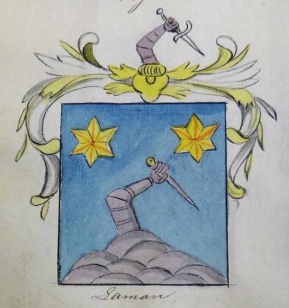 Laman – de arm met het zwaard lijkt uit de grond te komen, en doet daarmee denken aan de radijs van 1672, maar volgens Redmer Alma’s wapenlijst komt dat zwaard uit de wolken: