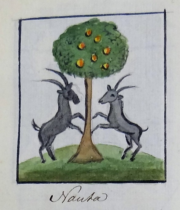 Nauta – twee opspringende sikkebokken tegen een oranjeboom met appelsienen: