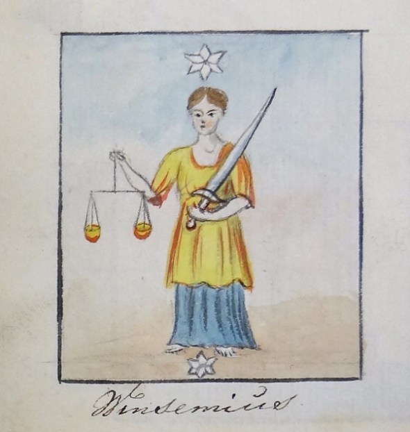 Vrouwe Justitia op het wapen van de familie Winsemius: